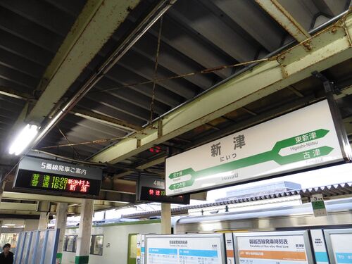 信越本線は、新津から先は本数が増えるので、乗ってきた新潟経由村上行き普通列車(115系L13編成)を新津で降り、次の列車に乗ることにしました。16:27着−51発(↓発車案内参照)、滞在時間は20分余りです。 ↑ 新津の駅名標も吉田同様、“>-さつき野−古津)…